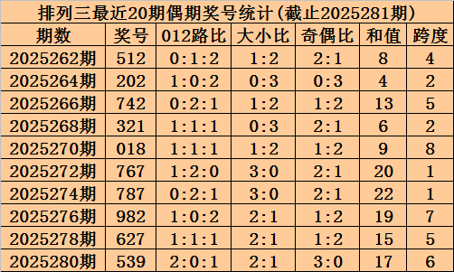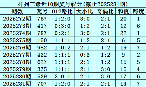 上期回来:胪列三2025281期奖号为707,奇偶比为2:1,大小比为2:1,跨度为14。