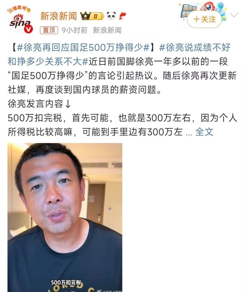 前国脚徐亮默示:国足500万挣得少,这个言论再次激发争议。